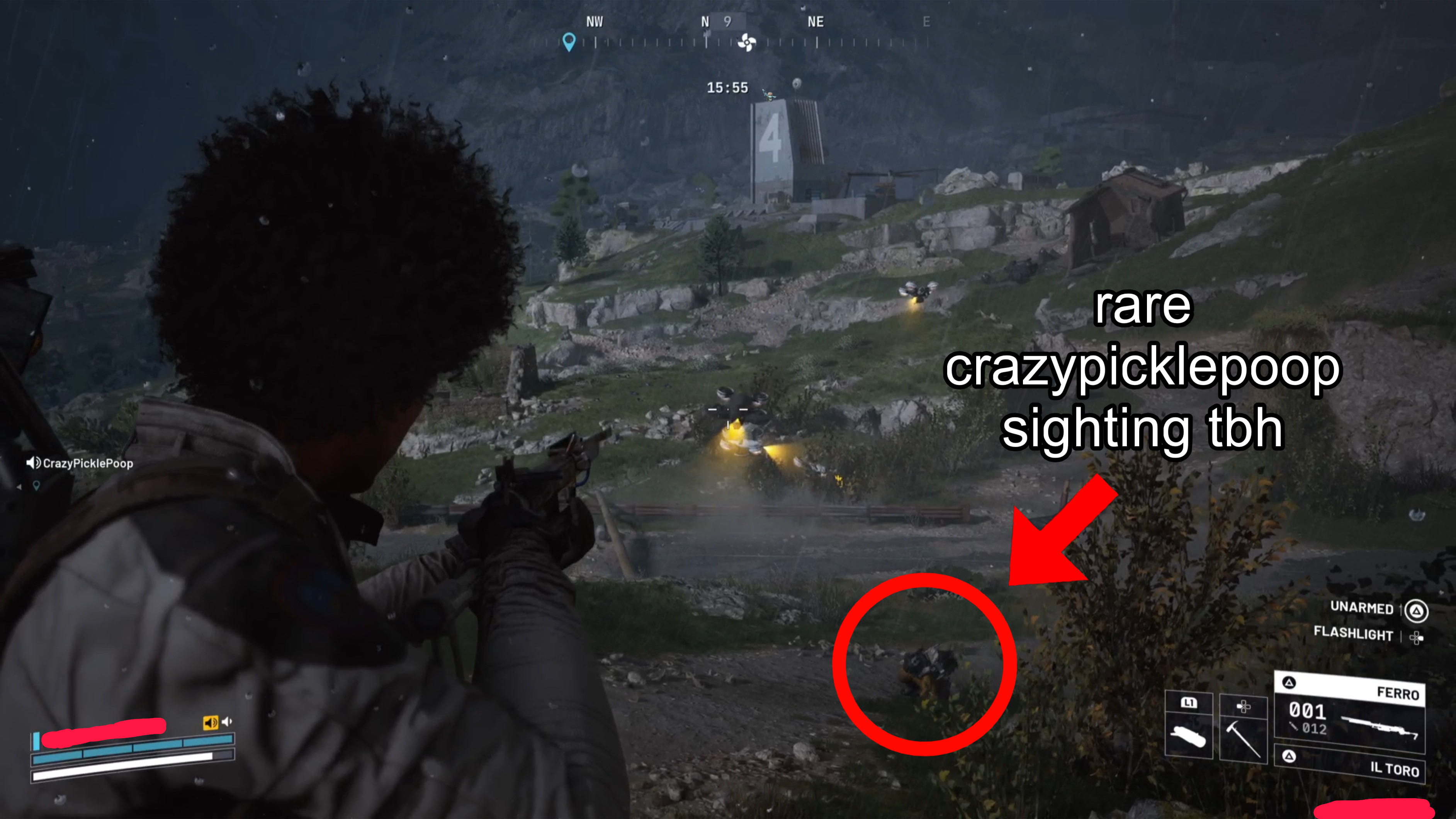 Behind me, I heard the other players shout “Oh god!” as they saw what was happening. I brought a smoke grenade into the match with me, and I threw it on top of CrazyPicklePoop as he crawled towards me. Clouded in the smoke, I thought I could revive him, but I didn’t have a Defibrillator on me to get him back on his feet. Surrounded on all four sides, the robots flying above us shot indiscriminately into the smoke, some of their bullets nicking me as CrazyPicklePoop shouted “Don’t be a hero! DON’T BE A HERO!” Somehow, all of us took out the enemy ARC, and with his dying words CrazyPicklePoop croaked “Just go down the road… You’ll find it…” before pretending to cough up blood. His body then went limp, firing off a signal flare into the rainy evening sky.